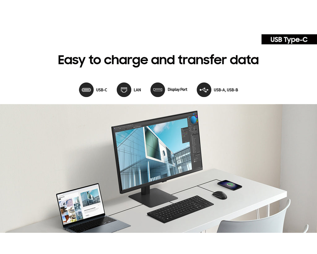 Connect it all to elevate your workspace. A USB-C port allows for 90W charging and data transfer at the same time, while a built-in LAN port offers seamless Ethernet connectivity for laptops.