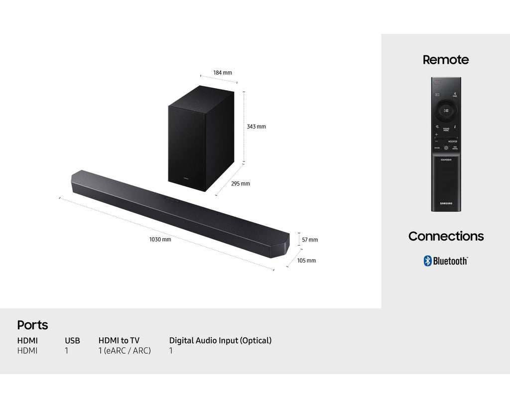 Simplify your life with a single remote. Samsung's Smart Remote lets you effortlessly control multiple connected devices with just one click. It's not just for your soundbar; it can link up with various compatible devices from your TV to your set-top box.5