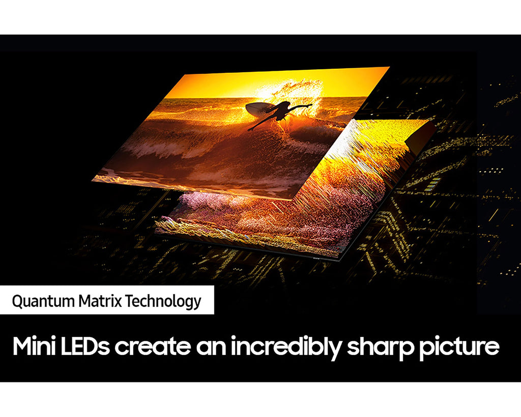 Samsung’s Neo QLED range uses Quantum Mini LEDs – lights that are 1/40th the size of conventional LEDs and approximately the size of a grain of sand. They are precisely controlled to create deep blacks, boosted brightness levels, and intense detail and contrast in every aspect of the picture.