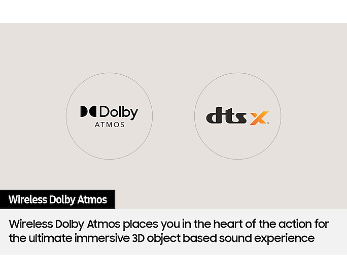 * Wireless Dolby Atmos transmission via Wi-Fi, works with (selected) 2022 Samsung TVs * Dolby Atmos and DTS:X applies to all 2022 Q Series Soundbars. * Dolby Atmos and Virual:X source content required.