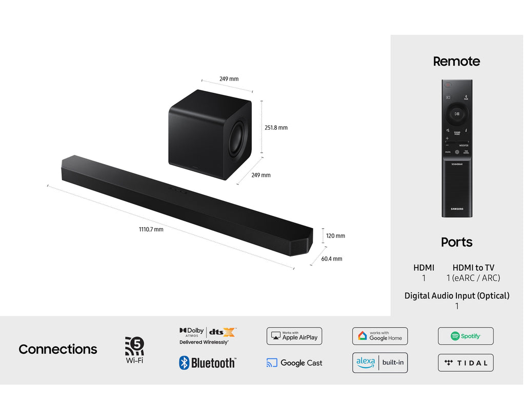 Features: ATMOS Music,ATMOS,Dolby 5.1ch,Dolby Digital Plus,Dolby True HD, Voice Enhance Mode, SpaceFit Sound Pro, Active Voice Amplifier Pro, Night Mode, Moderate Bass, Surround Sound Expansion, Game Pro, Adaptive Sound, HDR 10+, SmartThings App, Q-Symphony, Tap Sound, Chromecast, Spotify Connect, AirPlay, Wireless Dolby ATMOS, Tidal Connect, Works with Google, Alexa