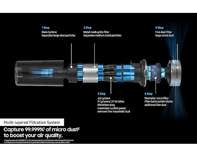 Enjoy cleaner air and extreme suction power with the Jet Cyclone’s high-efficiency, multi cyclone structure. An optimal air path reduces air resistance and its 9 cyclones with 27 air inlets minimise the loss of suction. It also traps fine dust that is sucked into the vacuum cleaner.