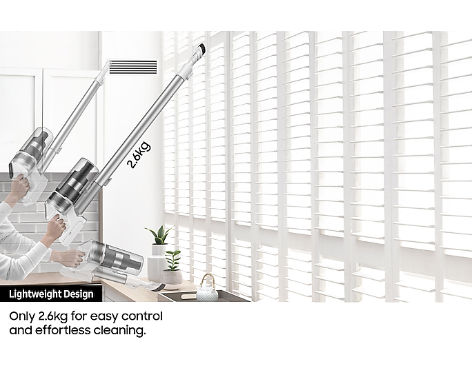 Clean your home effortlessly with easy control and movement. A lightweight design ensures maximum usability, and reduces the strain on your wrist. The handheld body weighs just 1.66kg, which is 12% lighter* than conventional Samsung cleaners. So you can easily clean all around your house.
